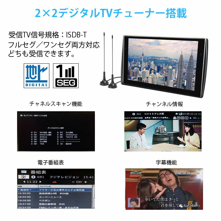 ■商品仕様液晶:11.6インチIPS液晶 解像度::1366×768pixelチューナー:2チューナー&2アンテナテレビ:地上デジタル 周波数・チャンネル:地上波UHF470MHz〜770MHz(13ch〜62ch)映像入力:V1/HDMI(タイプA) AV入力 動画フォーマット:MP4、MPG、MPEG2、RM、RMVB、JPG、MP3等 サイズ:約319(W)×約172(H)×約22(D)mm(本体最大部・スタンド含まず)重量:約550g電源:DC12V-24V セット内容:外国語説明書*1、本体*1、ヘッドレスト取付スタンド*1、シガーアダプター*1、AV入力ケーブル*1、リモコン*1、miniB-CASカード*1、 ※アンテナの近くにドライブレコーダーがあると、そのドライブレコーダーから発する電磁波で、TVが上手く映らない場合がございます。